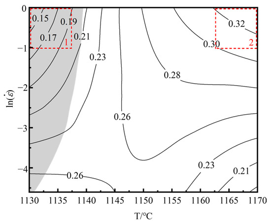 The hot processing map of the homogenized Ta-GH4151 alloy was obtained by superimposing the power dissipation map and the flow instability map, as shown in Figure 16. The shadow area is identified as the flow instability area, which is characterized by . By analyzing the different microstructures in the thermal processing map, we identified two main regions of thermal deformation mechanisms.