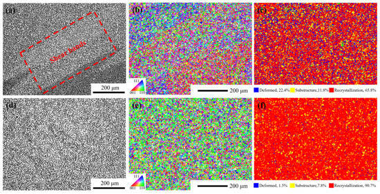 Region 1: The deformation temperature range is 1130–1140 °C, and the strain rate is 0.01–1 s−1. In this region, < 0. This region is unstable due to the deformation of alloy plastic. The main instability mechanisms of the alloy during hot deformation include adiabatic shear bands, local plastic flow and cracking [45]. As shown in Figure 17a–c, the recrystallization fraction of the alloy is only 65.8% at 1130 °C/1 s−1. Under this condition, the main instability mode of the alloy is the formation of adiabatic shear bands, which usually occur at low temperatures or high strain rates. Due to the short deformation time, the sample is approximately in an adiabatic state, resulting in the failure to effectively release the thermal energy generated during the deformation process, thus contributing to the formation of adiabatic shear bands.