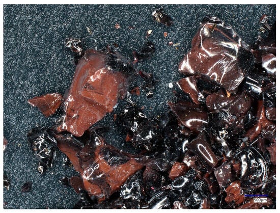 Two sanding agents, copper slag and glass beads, were used in the study. Copper slag is a by-product of copper ore smelting. The photos were taken at close range using a microscope (model: VHX 500, Keyence, Osaka, Japan). The microscopic view of copper slag is presented in