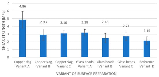 Table 4 shows the configuration diagram of the sample surface treatment with the designation that will be used further on in the article. Configurations A, B and C were divided into joints with the surface of the samples treated by using copper slag and those with the surface of the samples treated by using glass beads. The adhesive joint samples in configuration D were not sandblasted and were therefore the reference variant for both sandblasting agents. Five adhesive joints were prepared for each configuration variant. In total, there were 35 adhesive joints.