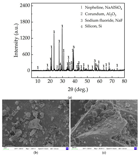 The waste barrier material used in this study was sourced from a sample provided by a solid waste utilization company in Qinghai Province. The materials had been pre-sorted using an intelligent sorting system. A comprehensive understanding of the physical, chemical, and mineralogical properties of waste barrier materials is crucial for their subsequent processing and utilization. Alumina refinery processing conditions, coupled with the diversity of bauxite sources and cell types, result in materials displaying a spectrum of colors, which range from gray-white and red-brown to black-gray, black, and white. The primary elemental composition of the material is shown in Table 1. The X-ray diffraction (XRD) analysis of the material is presented in Figure 1a, revealing that the main components are nepheline, corundum, sodium fluoride, and silicon. Microscopic analysis (Figure 1b,c) reveals that the waste barrier material primarily consists of irregularly shaped blocks, with its surface covered by numerous plate-like or spherical particles.