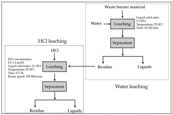 Hydrochloric acid (HCl) has emerged as a popular choice for leaching industrial waste due to its cost-effectiveness and availability [13], making it a viable option for extracting lithium from waste barrier material. However, this approach presents several challenges, including low selectivity and the generation of harmful hydrogen fluoride gas, which can contribute to environmental pollution [14]. To address these issues, as well as the inefficient use of fluorine resources commonly associated with traditional acid-leaching methods, a water–HCl sequential leaching (WHSL) approach has been proposed. In this method, soluble fluoride salts are dissolved in water, thereby preventing the formation of HF gas and significantly reducing acid consumption during the processing of alkaline waste barrier materials. This strategy effectively mitigates the environmental impact while improving the efficiency of the leaching process.