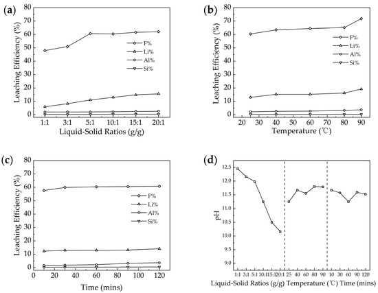 As illustrated in Figure 4a–c, the leaching rates for F and Li were approximately 50–70% and 5–20%, respectively, while the leaching rate for Al was around 2–4%, and for Si, it was about 0.2–0.4%. A higher liquid-to-solid ratio and elevated temperatures were beneficial for the leaching of F and Li, while the duration of leaching had minimal impact on the water leaching rates. As for the pH during leaching by water, the liquid–solid ratio had a significant impact on pH as expected; the higher liquid–solid ratio obtained a lower pH, while temperature and time had a limited impact on leaching pH.