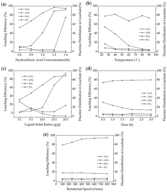 As the concentration of HCl increases in Figure 5a, the leaching efficiency of Li and Al also increases, while the extraction rate of Si keeps constant below 1.4 mol/l, and fluoride distribution in leachate decreases. For optimal selective leaching of Li with minimal leaching of other elements, an HCl concentration of 0.6 mol/L is recommended. At this concentration, Li leaching efficiency reached 53%, while Al and Si leaching efficiencies were 9% and 4%, respectively.