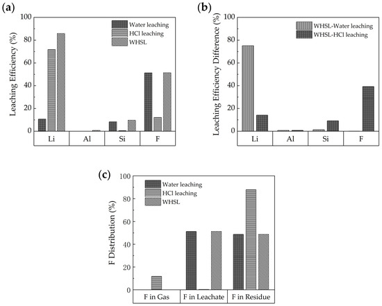 The water leaching efficiencies of Li, Si, and F are 11%, 8%, and 51%, respectively, while the Li leaching efficiency in HCl leaching achieved 72%, as shown in Figure 6a. As for WHSL, the Li, Al, Si, and F leaching efficiencies are 86%, 1%, 10%, and 51%, respectively. As shown in Figure 6b, compared to water leaching, the Li leaching efficiency increased by 75%, while Al, Si, and F have limited change in WHSL. As compared to HCl leaching, the Li and F leaching efficiencies increased by 14% and 39%, respectively, in WHSL.