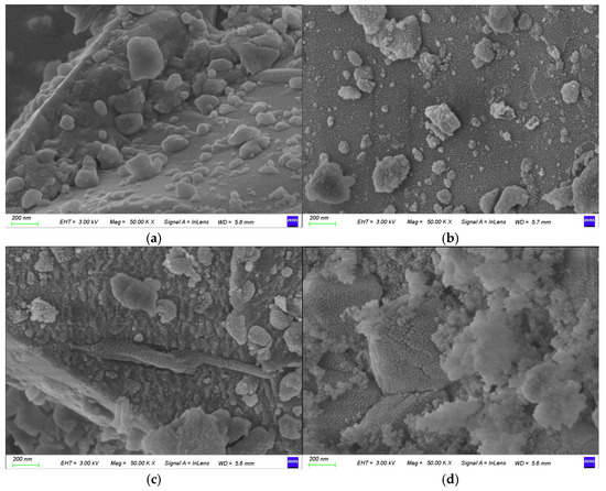 SEM images of the waste barrier material and the residues subjected to various leaching treatments are shown in Figure 8. The waste barrier material (Figure 8a) consists mainly of block-like structures with smooth, spherical surfaces. After HCl leaching (Figure 8b), the residue exhibits a slightly rougher texture, likely due to the dissolution of nepheline, corundum, and sodium fluoride. The residue from the water leaching (WHSL, Figure 8c) also displays a roughened surface with distinct grooves, probably resulting from sodium fluoride dissolution. HCl leaching (WHSL) (Figure 8d) reveals a further roughened surface with white, flaky deposits, which are likely silica gel or aluminum fluoride hydroxide formed during acid treatment. XRD data (Figure 7) corroborate the formation of aluminum hydroxide fluoride, thereby supporting the observed morphological changes. Both HCl leaching and HCl leaching (WHSL) induce significant surface changes, including a loss of compactness and the formation of cracks.