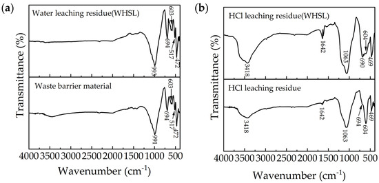 FTIR results from waste barrier material and leached residue in different conditions, (a) water leaching residue(WHSL) and waste barrier material, (b) HCl leaching residue(WHSL), HCl leaching residue.