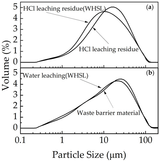 The particle size distribution of the waste barrier material and its leaching residue is presented in Figure 10. Following water leaching (WHSL), the particle size of the waste barrier material slightly decreases and shifts towards the left (Figure 10b). In contrast, after HCl leaching, the particle size of the residue (Figure 10a) shows a more significant leftward shift, with the residue after HCl treatment (WHSL) exhibiting the most notable reduction.