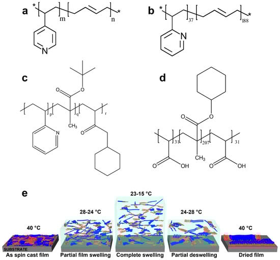 Chemical structures of P4VP-b-PB (a), P2VP-b-PB (b), P2VP-b-PtBMA-b-PCHMA (c), and PAA-b-PCHMA-b-PAA (d) BCPs studied in this work. Here, indices represent the number of corresponding repeating monomer units (m is 34 or 43, n takes the values of 70 or 207, p represents 25 or 107, q is 12 or 52, r replaces 173 or 604). (e) Schematics illustrating the expected mechanism of self-assembly during the film swelling/deswelling procedure conducted through C-SVA.