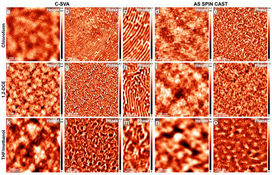AFM height and phase micrographs emphasizing the morphology of thin films of P4VP34-b-PB207 obtained by spin casting from chloroform (a–e), 1,2-DCE (f–j), and THF/methanol (k–o) solutions, before (d,e,i,j,n,o) and after (a–c,f–h,k–m) their further processing via C-SVA in the corresponding solvent vapors.