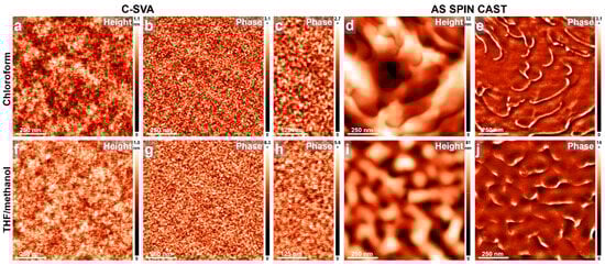 AFM height and phase micrographs emphasizing the morphology of thin films of P4VP43-b-PB70 obtained by spin casting from chloroform (a–e) and THF/methanol (f–j) solutions, before (d,e,i,j) and after (a–c,f–h) their further processing via C-SVA in the corresponding solvent vapors.