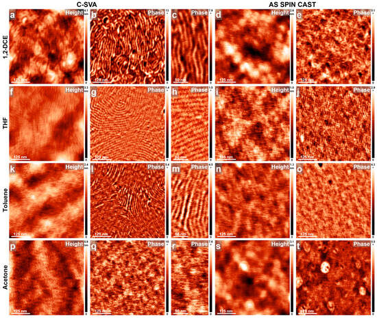 AFM height and phase micrographs emphasizing the morphology of thin films of P2VP37-b-PB188 obtained by spin casting from 1,2-DCE (a–e), THF (f–j), toluene (k–o), and acetone (p–t) solutions, before (d,e,i,j,n,o,s,t) and after (a–c,f–h,k–m,p–r) their further processing via C-SVA in the corresponding solvent vapors.