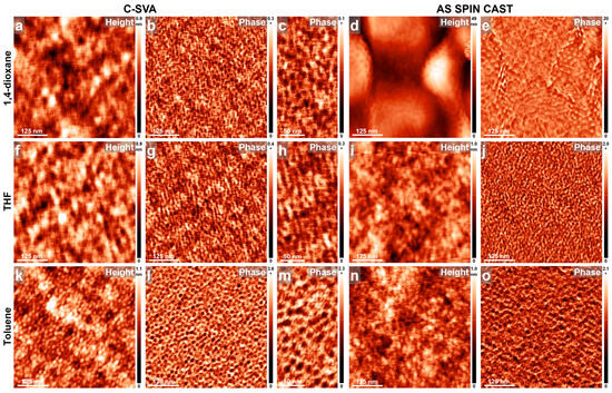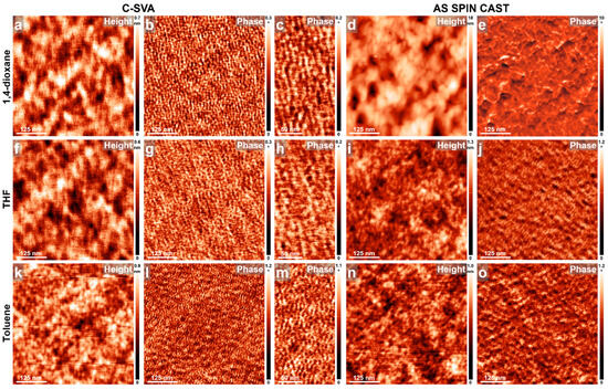 AFM height and phase micrographs depicting the morphology of thin films of P2VP25-b-PtBMA12-b-PCHMA173 obtained by spin casting from 1,4-dioxane (a–e), THF (f–j), and toluene (k–o) solutions, before (d,e,i,j,n,o) and after (a–c,f–h,k–m) their further processing via C-SVA in the corresponding solvent vapors.