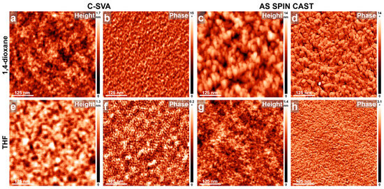 AFM height and phase micrographs showing the morphology of thin films of PAA31-b-PCHMA207-b-PAA31 obtained by spin casting from 1,4-dioxane (a–d) and THF (e–h) solutions, before (c,d,g,h) and after (a,b,e,f) their further processing via C-SVA in the corresponding solvent vapors.