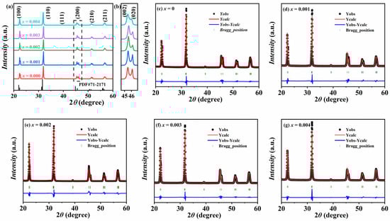 The Rietveld refinement of all samples was carried out using the Fullprof software based on the O-phase (Amm2) model to determine the lattice parameters. The refinement results and relevant parameters are shown in Figure 1c–g and Table 1. The low values of χ2 and Rwp for all samples indicate that the fitting results are reliable. As can be seen from the table, the phase composition of all fitting results is 100%, which means that all the doped samples are in the O-phase at room temperature. With the increase in the doping amount, the cell volume first decreases and then increases, which is consistent with the variation trend of the (200) diffraction peak. Regarding the broadening of the (200) diffraction peak, the samples with x = 0.001–0.003 show a degree of broadening that is basically consistent with that of the undoped sample. The sample with x = 0.004 exhibits the most significant peak broadening, which may be related to the presence of a relatively large number of defects inside the ceramic and the refinement of the grains.