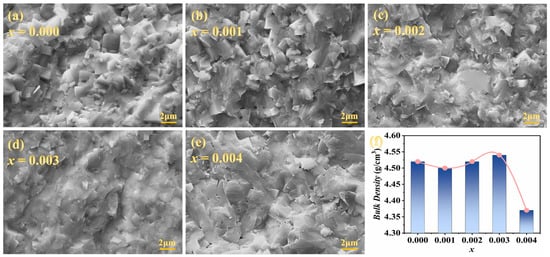 Figure 2a–e shows the SEM micrographs of fractured surfaces of the KNSN ceramics. It can be seen that the grains of all samples exhibit a typical cubic shape and are arranged relatively densely. Compared to the sample with x = 0.001, some small grains appeared in the ceramics with x ≥ 0.002, which filled the voids between large grains and improved the density of the ceramics. This may be due to the donor ion doping feature of Sm3+ on the A-site. When Sm3+ replaces the A-site ions (K+ or Na+), cationic vacancies occur to maintain the charge balance within the ceramics. Vacancy-type defects concentrated near the grain boundaries usually exert a “pinning effect” on the movement of grains and inhibit the growth of grains [6,23]. For the sample with x = 0.004, some grains fused together, probably due to the more introduction of Sm3+, which caused the theoretical sintering temperature of the KNSN ceramics to be lower than the actual sintering temperature, resulting in the formation of liquid phase inside the ceramics. Excessive liquid phase accumulation at grain boundaries can inhibit grain growth and lead to the appearance of more voids, which may be the reason for the sharp decrease in density of the x = 0.004 sample [24].