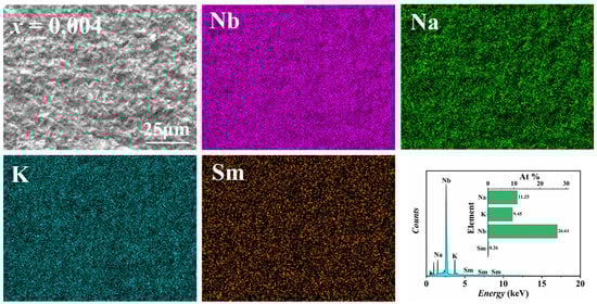 In order to analyze the variation in elemental species and contents within each sample at different doping amounts, EDS was used to test the composition and contents of all KNSN ceramic samples. Figure 3 shows the SEM-EDS plot for x = 0.004 doping. From the figure, it can be seen that there is no agglomeration or segregation of the four main elements in the observed area, indicating that each element is evenly distributed within the matrix.