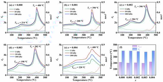 (a–e) Temperature-dependence of dielectric constant and the value of dielectric loss angle tangent of KNSN ceramics; (f) TO−T and TC as a function of x.