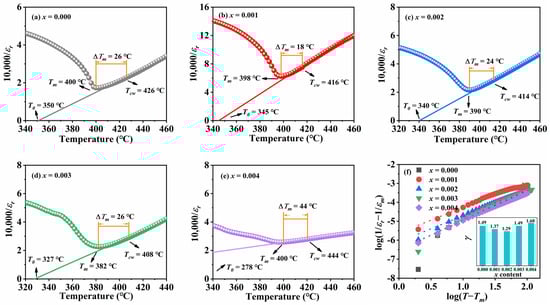 (a–e) The reciprocal of the dielectric constant of KNSN ceramics and temperature; (f) (illustrated as the variation in diffusion factor with x).