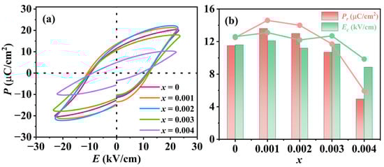 Figure 6a shows the polarization–electric field (P–E) hysteresis loop of KNSN ceramic samples at E = 20 kV/cm, and all ceramic samples exhibit typical ferroelectric characteristics. The hysteresis loop of the sample with x = 0.004 is unsaturated, which may be attributed to the presence of numerous internal voids and poor densification in the ceramics, resulting in insufficient flipping of the electric domains during the polarization process [30]. Figure 6b depicts the relationship between remnant polarization Pr, coercive field EC, and doping amount x. As the doping amount increases, Pr exhibits a tendency to increase and then decrease, and achieves the maximum value at x = 0.001 (Pr = 13.6 μC/cm2).