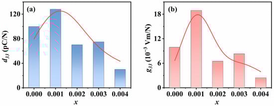 where εr is the relative dielectric constant and ε0 is the vacuum dielectric constant. As can be seen from Figure 7, the values of d33 and g33 for all ceramic samples exhibit a similar trend, reaching their maximum values at x = 0.001 (d33 = 128 pC/N, g33 = 18.9 × 10−3 Vm/N). This result also indicates that the ceramics with x = 0.001 doping level have more outstanding overall piezoelectric properties.