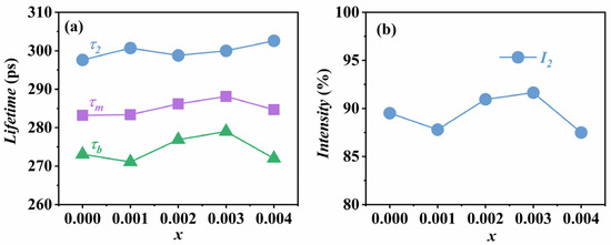 Figure 8a shows the variation in the second lifetime τ2, the average lifetime τm, and the bulk lifetime τb with the doping amount obtained from the three-components fitting. The values of τm and τb are calculated using the following formula: