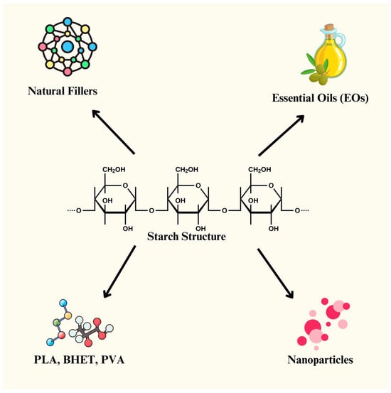Starch is a biopolymer consisting of d-glucose subunits connected by glycosidic bonds containing varying amounts of amylopectin (80–90%) and amylose (10–20%), where amylose is a linear polysaccharide with α-(1-4)-linked d-glucose units and amylopectin is a highly branched molecule with α-(1-6)-linked branches [14]. The higher proportion of amylopectin increases the crystallinity of starch, whereas amylose provides better tensile strength, a lower elongation at break, and a higher Young’s modulus [15]. From these properties, starch has great potential to be used to develop bioplastics due to its biodegradability, renewability, and availability in large quantities, and currently, 50% of developed bioplastics are starch-based; thus, it is predicted to be the dominant material source in the industry by 2030 [16,17]. Many previous studies have produced bioplastics from natural starch sources such as banana peel [18], corn [19], rice [20], cassava [21], tapioca [22], sago [23], and potato starch [24]. Over time, many researchers have found innovative ways to improve the properties by adding natural fillers, essential oils, nanoparticles, and polymer blends (PLA, BHET, and PVA), as is shown in Figure 2. This section discusses the recent work performed in developing starch-based bioplastics.