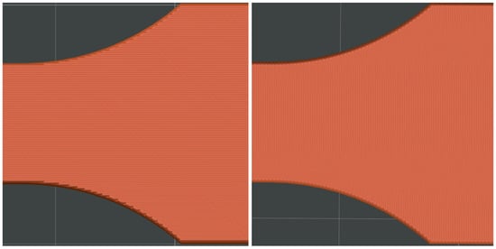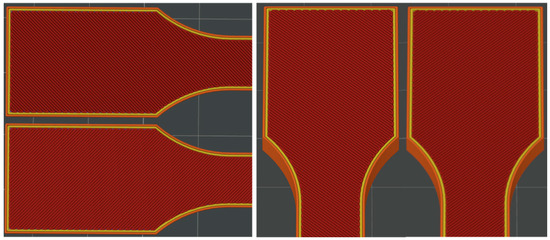 The pattern of two consecutive layers ((left)—the X print direction; (right)—the Y print direction) for each of the eight series of samples intended for the tensile strength tests. Despite the different orientation of the samples on the print bed during printing along the X- and Y-axes, the layer pattern orientation remains the same relative to the sample.