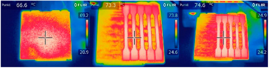 The pictures in the middle and on the right display the temperature of the sample during the printing process, with the extrusion temperature set at 220 °C.