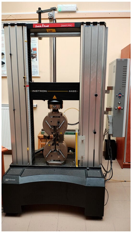 The tensile test was performed in accordance with DIN EN ISO 527-1 on an Instron 4405 (Instron, Norwood, MA, USA) universal testing machine (Figure 5) with a maximum tensile force of 200 kN. The machine was equipped with a Zwick/Roell BZ1-MM4485.IN01 (Zwick/Roell Ltd., Ulm, Germany) measuring system. The Zwick/Roell BTC-EXMACRO.M11 (Zwick/Roell Ltd., Ulm, Germany) extensometer was used for the measurements. The measurement length to determine the strain was 50 mm. The method of determining the mechanical properties was as described in the standard, and strength parameters such as Young’s modulus and conventional yield strength were determined in accordance with the standard. The testXpert II V3.2 testing machine software was used to record and process the measurements. The test conditions were defined as per the standard. The Figure 5 shows the measuring station.