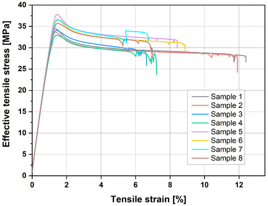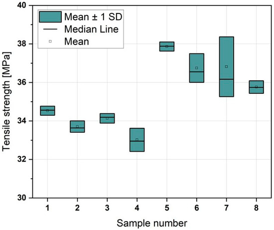 The trends described above are visible at the peak of the stress–strain curve based on the average values. The data suggest that higher tensile values are obtained for samples printed along the Y-axis (Samples 5 to 8) than for those printed along the X-axis (Samples 1 to 4). The curve also demonstrates that greater elongation is observed in samples printed at 30 mm/s (Samples 1 and 2, as well as 5 and 6). There is also a noticeable difference between the axes, as samples printed along the X-axis elongated more before breaking than those printed along the Y-axis. Samples printed at 500 mm/s showed no significant differentiation in terms of elongation based on the axis. Similarly, no relationship between ironing and elongation could be established.