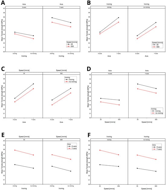 Title: Statistical Analysis of the Significance of Parameters in the Tensile Strength Test: (A) analysis of the influence of speed on the variables: printing axis and the application of the ironing option, (B) analysis of the influence of speed on the variables: application of the ironing option and printing axis, (C) analysis of the influence of ironing on the variables: speed and printing axis, (D) analysis of the influence of ironing on the variables: printing axis and printing speed, (E) analysis of the influence of the axis on the variables: printing speed and ironing, (F) analysis of the influence of the axis on the variables: ironing and printing speed.