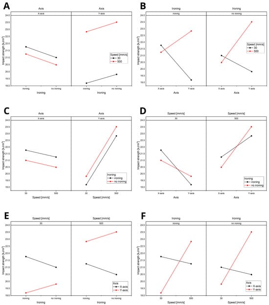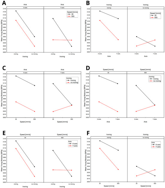 Title: Statistical Analysis of the Significance of Parameters in the Young’s Modulus Test: (A) analysis of the influence of speed on the variables: printing axis and the application of the ironing option, (B) analysis of the influence of speed on the variables: application of the ironing option and printing axis, (C) analysis of the influence of ironing on the variables: printing axis and printing speed, (D) analysis of the influence of ironing on the variables: speed and printing axis, (E) analysis of the influence of the axis on the variables: printing speed and ironing, (F) analysis of the influence of the axis on the variables: ironing and printing speed.