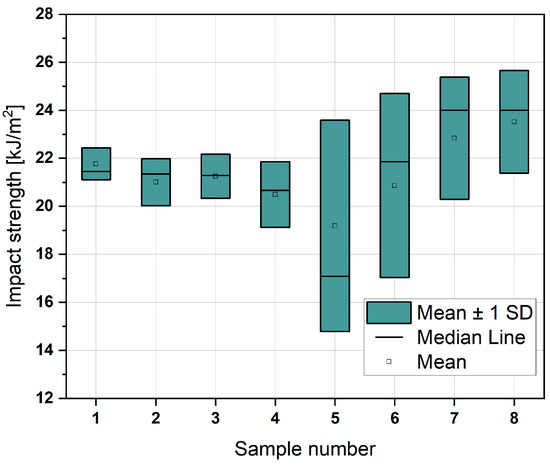 To further investigate the mechanical properties, a three-point bending test was conducted in accordance with ISO 178 [60], and an impact strength test was performed in accordance with ISO 179 [61]. Both tests utilised rectangular prism-shaped specimens with dimensions of 80 × 10 × 4 mm.