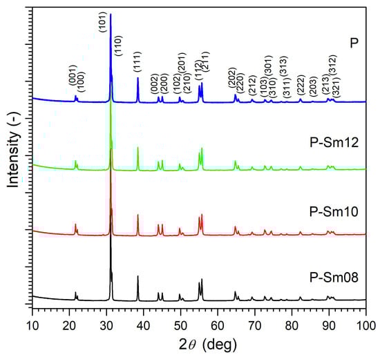 X-ray pattern of the PZT-type samples: P, P-Sm8, P-Sm10, and P-Sm12.