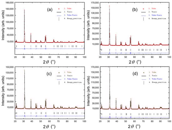 Pawley’s refinement of the PZT-type samples: (a) P, (b) P-Sm8, (c) P-Sm10, and (d) P-Sm12.