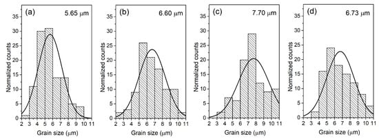 Grain size distribution for the PZT-type sample: (a) P, (b) P-Sm8, (c) P-Sm10, and (d) P-Sm12.