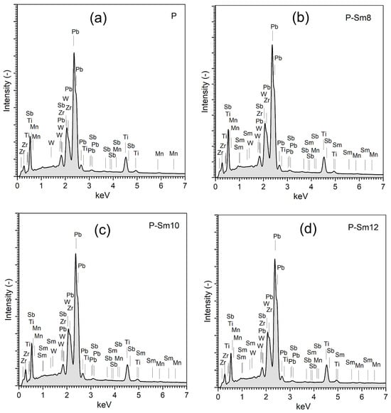 The EDS analysis of the element distribution for the multicomponent PZT-type samples: (a) P, (b) P-Sm8, (c) P-Sm10, and (d) P-Sm12.