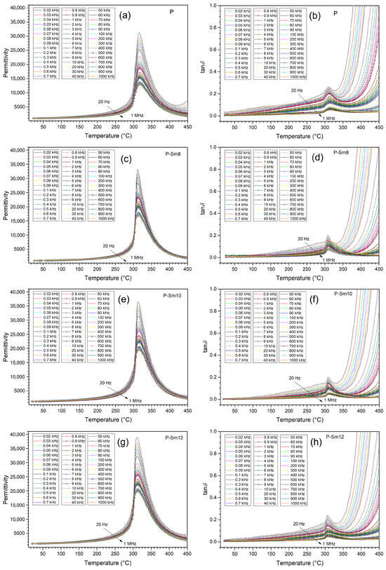 Temperature dependencies of the permittivity (a,c,e,g) and dielectric loss factor tanδ (b,d,f,h) of the PZT-type ceramic samples: (a,b) P, (c,d) P-Sm8, (e,f) P-Sm10, and (g,h) P-Sm12.