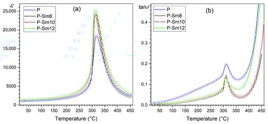 Measurements of the dielectric properties of PZT ceramic materials performed in the temperature range from RT to 450 °C showed high permittivity values with a clearly defined phase transition point (Figure 6). At room temperature, the permittivity ε for the P material is 1025, while for the compositions with samarium doping, the permittivity values are higher, i.e., 1040, 1267, and 1365, for P-Sm8, P-Sm10, and P-Sm12, respectively. With increasing temperature, the permittivity values systematically increase to reach a maximum at the phase transition temperature (Tm). At Tm, the doped PZT compositions also have high maximum permittivity values and are 23,987, 24,480, and 25,390, for P-Sm8, P-Sm10, and P-Sm12, respectively (Table 3). For comparison, at Tm, the εm value of the P material is 18,468. In ferroelectric materials, there is also a phenomenon of a decrease in the permittivity value with increasing frequency, which indicates a low-frequency dispersion phenomenon observed in the temperature permittivity graph. High permittivity values at low frequencies are interpreted by the polarization of the space charge at the grain boundaries, which results in the formation of a potential barrier. The accumulation of space charge at the grain boundary increases the dielectric constant of ceramic materials, while the occurring dielectric dispersion results from the increased effect of the grain boundary interaction compared to the much weaker effect of the grain interaction [43]. At higher frequencies, the electric dipole (space charge) is not reorienting itself enough to follow the applied external field, which results in a decrease in permittivity with increasing frequency [44].