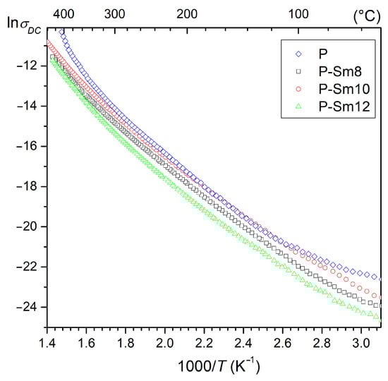 where σ0—pre-exponential factor, kB—Boltzmann constant, Ea—activation energy, and T—absolute temperature [49]. The calculated values of the activation energy are listed in Table 3. At a lower temperature range (<300 °C), the activation energies Ea of the ceramic samples are 0.71 eV (for P), 0.65 eV (for the P-Sm8), 0.62 (for the P-Sm10), and 0.65 eV (for the P-Sm12). At higher temperatures (>300 °C), the activation energies Ea are higher, i.e., 1.13 eV (for P), 0.93 eV (for the P-Sm8), 0.91 eV (for the P-Sm10), and 1.01 eV (for the P-Sm12). Above 350 °C, the increase in conductivity is greater for sample P (Figure 8).