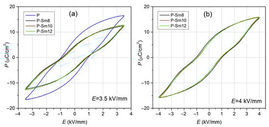 Figure 9 depicts the P-E hysteresis loops of the PZT-type ceramic samples at RT. The P-E research showed the resultant ferroelectric properties of PZT ceramic samples, i.e., intermediate properties between ferro-hard and ferro-soft materials, and a narrowing of the loop occurs at polarization P = 0. For the reference composition P at RT, the residual polarization Pr, the maximum polarization Pm, and the coercive field Ec values measured at 3.5 kV/mm are 7.27 μC/cm2, 16.45 μC/cm2, and 0.97 kV/mm, respectively (Figure 9a, Table 3). In the case of samarium-doped compositions, the polarization values are lower and differ only slightly; Pr in the range of 4.24–4.65 μC/cm2 and Pm in the range of 12.38–12.72 μC/cm2. With the increase in the samarium dopant amount, the coercive field Ec of PZT ceramic materials decreases. Ec is 0.89 kV/mm for P-Sm8, 0.84 kV/mm for P-Sm10, and 0.78 kV/mm for P-Sm12. The lower coercive field of the doped compositions allows for easier repolarization of the loop, and their lower conductivity allows for the application of a stronger external field E and for higher polarization values to be obtained (Figure 9b, Table 3).