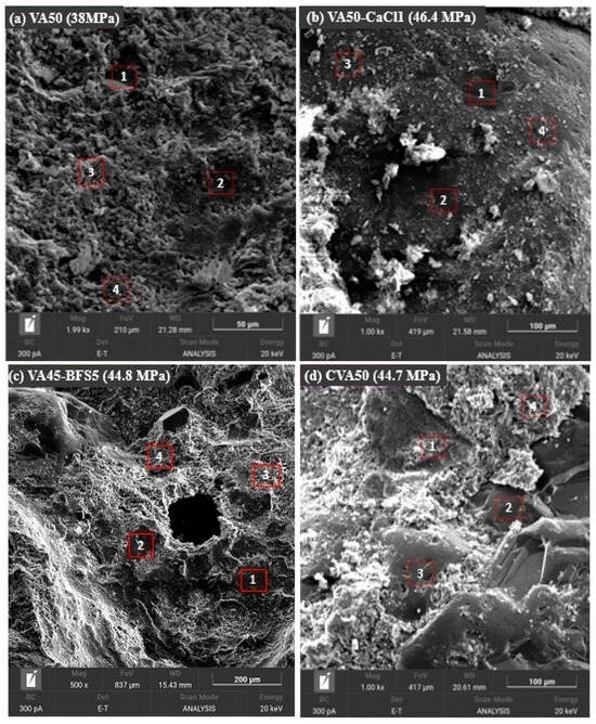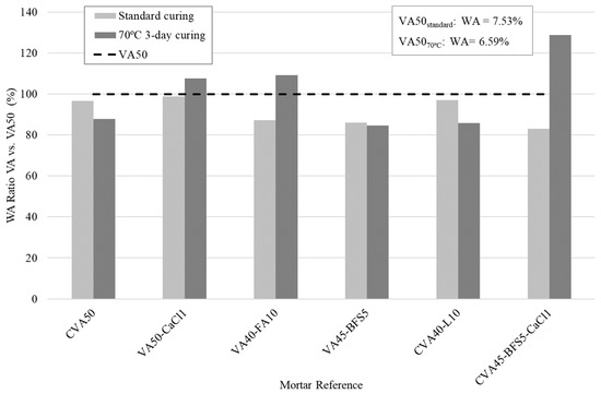 The AA, based on 1% of CaCl2 as an activator, caused the positive effect in accelerating the pozzolanic reactions of VA with OPC, which may be attributed to the increased formation of secondary hydration products, contributing to faster strength development during the early curing stages of the mortar, as described by Juenger et al. [53]. López-Salas and Escalante-García [54] and Kupwade-Patil et al. [41] highlighted that curing at temperatures between 40 and 90 °C enhances the mechanical properties of alkali-activated VA mortars.