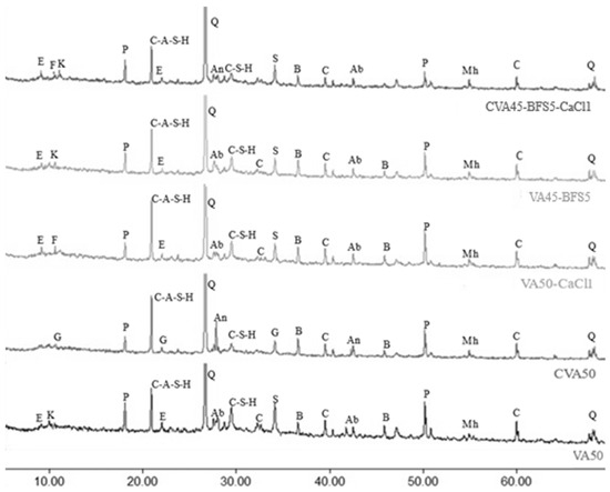 In Phase 2, the activated mortars of CVA50, VA50-CaCl1, VA40-FA10, VA45-BFS5, CVA40-L10, and CVA45-BFS5-CaCl1 under standard curing and thermal curing at 70 °C were analysed in comparison to OPC and VA50.