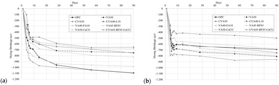 The drying shrinkage values were determined following the ASTM C157 specifications using 25 × 25 × 285 mm3 prismatic specimens. The samples were initially cured in a humid chamber at 22 ± 1 °C and 95% RH, sealed within their moulds with plastic film for 24 h. After this period, the samples were demoulded, and their initial length (original length) was measured on the first day as the reference. Following that, they were transferred to a climate-controlled chamber maintained at 20 ± 2 °C and 50% RH, where they remained until the end of the testing period. Changes in the length of the specimens were recorded at 5, 6, 7, 9, 14, 28, 56, and 90 after casting.