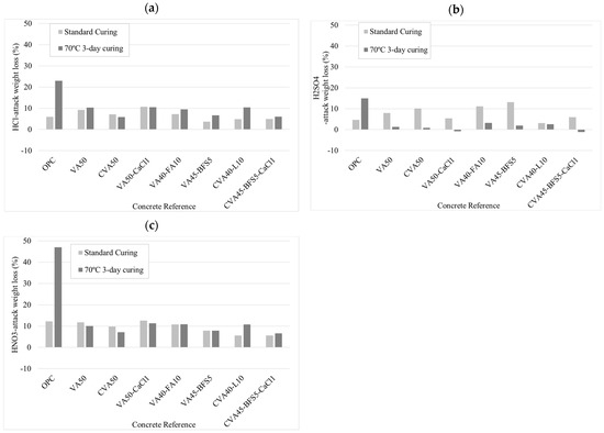 - The VA mortar achieved the lowest resistance to HNO3 attack, with up to 10% weight loss reduction, regardless of the curing method applied. The mixed activation mortar (CVA45-BFS5-CaCl1) demonstrated superior acid resistance under both curing conditions compared to other activation strategies. Furthermore, thermal curing enabled all mortars to achieve greater resistance than OPC mortar against all three acids studied, irrespective of the acid immersion.