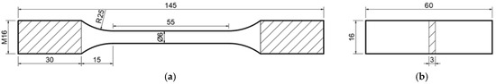 Dimensions of the test samples (unit: mm). (a) Tensile test sample; (b) vibration test sample.