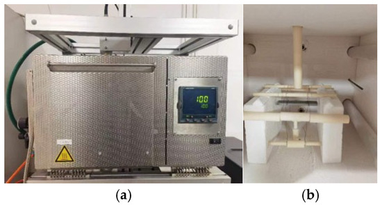 Figure 2a presents the vibration test machine (RFDA HT650, IMCE, Belgium) that was used to measure the Young’s modulus. The machine consisted of a power system, a furnace, and transducers, which convert vibration signals into electrical signals and vice versa. The high-temperature vibration test process is as follows. (1) The sample is suspended in the furnace using two copper wires, as depicted in Figure 2b. (2) The temperature is increased to the pre-selected value and held for 10 min, with a heating rate of 10 °C per minute. (3) The vibration switch is activated to measure the fundamental resonant frequency. (4) Steps 2 and 3 are repeated to measure the fundamental resonant frequency of the material at various temperature levels. Finally, the Young’s modulus is calculated from the measured fundamental resonant frequency using the formulae provided in [55] (see Equations (1) and (2)).