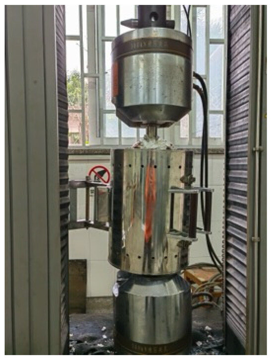 Following [3], the steady-state test method was employed to evaluate the high-temperature mechanical properties of the SHTB. The steady-state tensile tests were conducted at nine distinct elevated temperatures: 100, 200, 300, 400, 500, 600, 650, 700, and 750 °C. To ascertain the original mechanical properties of the SHTB, three coupons were also tested without fire exposure. The heating procedure took place in an electric furnace, as depicted in Figure 3. As shown in Figure 4, two clamps were utilized to secure the test specimen to the testing machine, which was a CMT5305 universal testing machine from MTS Industrial Systems (China) Co. Ltd., Shenzhen, China.