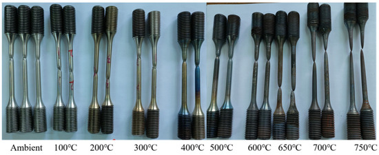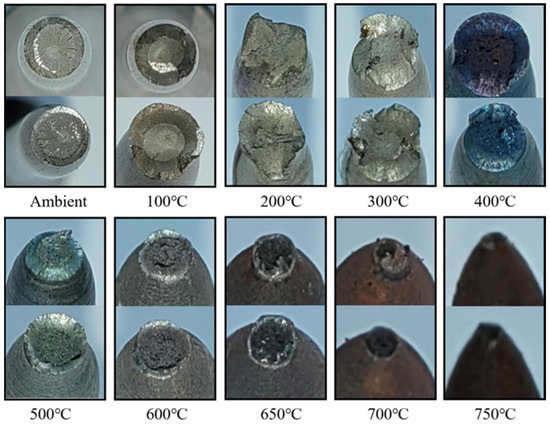 Figure 5 shows the photos of the samples after testing. All specimens failed with a ductile fracture showing a marked necking phenomenon, and the necking became more significant with temperatures larger than 500 °C. Furthermore, with an increase in the tested temperature, the surface of the tested samples gradually changed from silvery at ambient temperature (about 20 °C), to golden yellow at 300 °C, to a mix of golden-yellow and blue at 400 °C, and finally to black at 600~750 °C. Studies [57,58] have shown that oxidation on the bolt surface is the main reason for its color change. At the same time, due to the difference in oxidation products when oxidation occurs in different temperature ranges, the bolts will show different colors after experiencing different temperatures. Moreover Figure 6 presents the failure surfaces of the coupons after being tested at various high temperatures. Visible necking phenomenon and shear lips could be seen from the photos, which became more significant with the increase in temperature, also indicating that the SHTB possessed ductile failure characteristics [2,13].